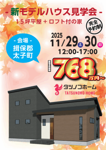 揖保郡太子町で15坪+ロフトの平屋モデルのオープンハウスイベントを開催します!